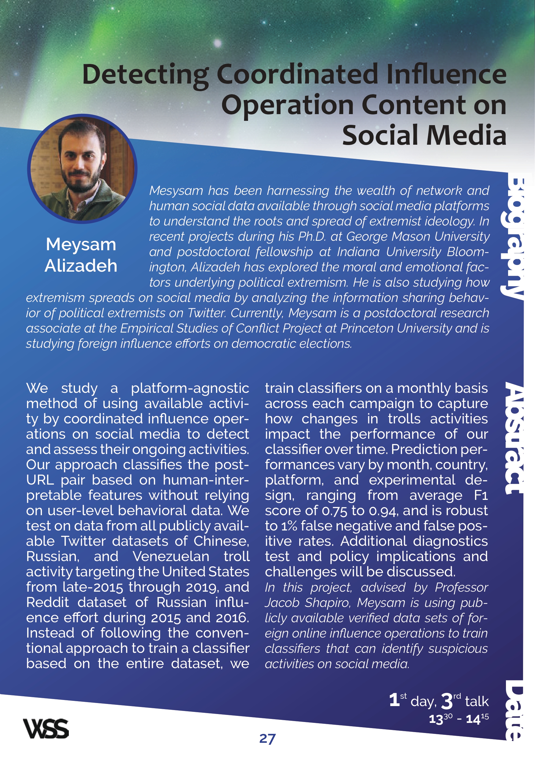 We study a platform-agnostic method of using available activity by coordinated influence operations on social media to detect and assess their ongoing activities. Our approach classifies the post-URL pair based on human-interpretable features without relying on user-level behavioral data. We test on data from all publicly avail-able Twitter datasets of Chinese, Russian, and Venezuelan troll activity targeting the United States from late-2015 through 2019, and Reddit dataset of Russian influence effort during 2015 and 2016. Instead of following the conventional approach to train a classifier based on the entire dataset, we train classifiers on a monthly basis across each campaign to capture how changes in trolls activities impact the performance of our classifier over time. Prediction per-formances vary by month, country, platform, and experimental design, ranging from average F1 score of 0.75 to 0.94 , and is robust to 1% false negative and false pos-itive rates. Additional diagnostics test and policy implications and challenges will be discussed. In this project, advised by Professor Jacob Shapiro, Meysam is using publicly available verified data sets of foreign online influence operations to train classifiers that can identify suspicious activities on social media.