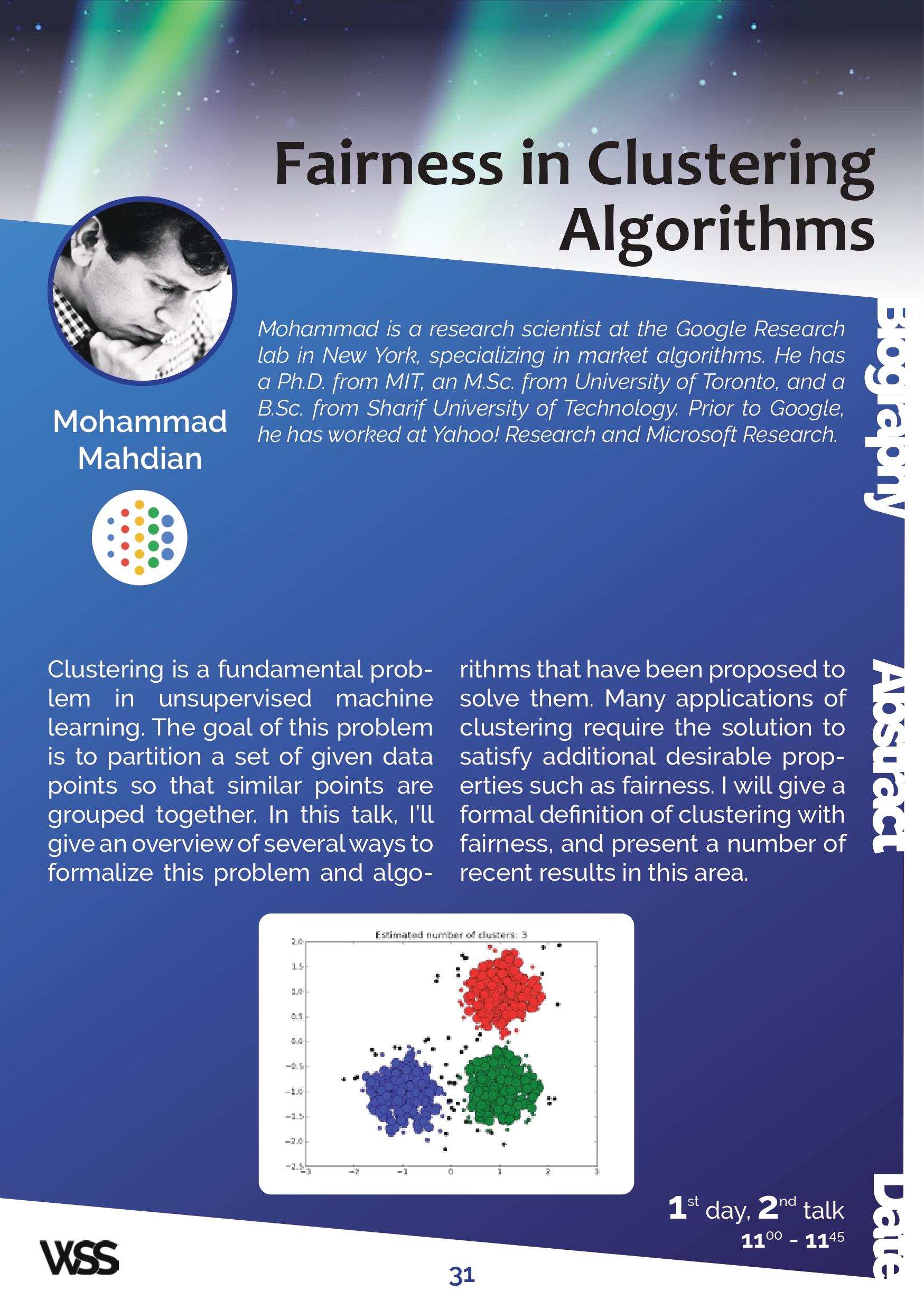Clustering is a fundamental problem in unsupervised machine learning. The goal of this problem is to partition a set of given data points so that similar points are grouped together. In this talk, I’ll give an overview of several ways to formalize this problem and algorithms that have been proposed to solve them. Many applications of clustering require the solution to satisfy additional desirable properties such as fairness. I will give a formal definition of clustering with fairness, and present a number of recent results in this area.