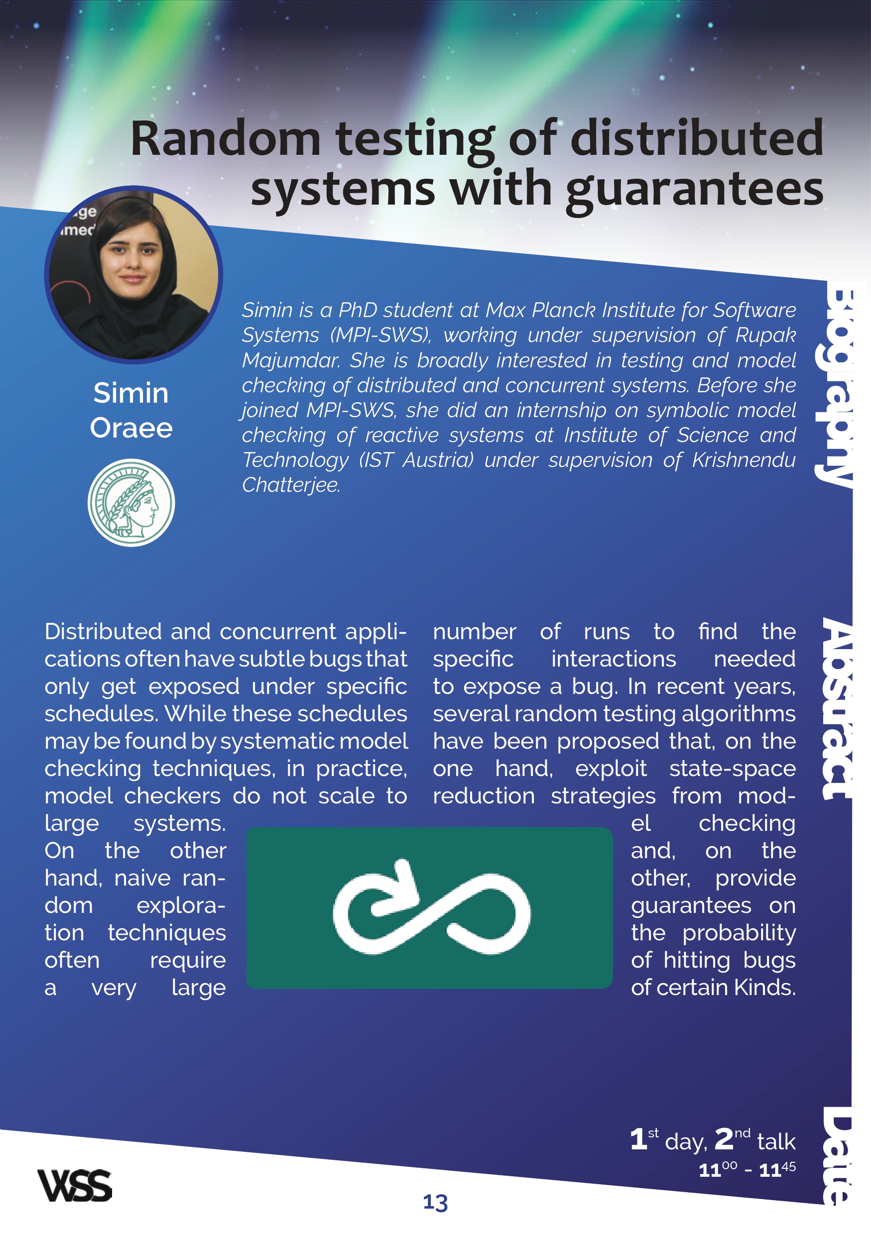Simin is a PhD student at Max Planck Institute for Software Systems (MPI-SWS), working under supervision of Rupak Majumdar. She is broadly interested in testing and model checking of distributed and concurrent systems. Before she joined MPI-SWS, she did an internship on symbolic model checking of reactive systems at Institute of Science and Technology (IST Austria) under supervision of Krishnendu Chatterjee.